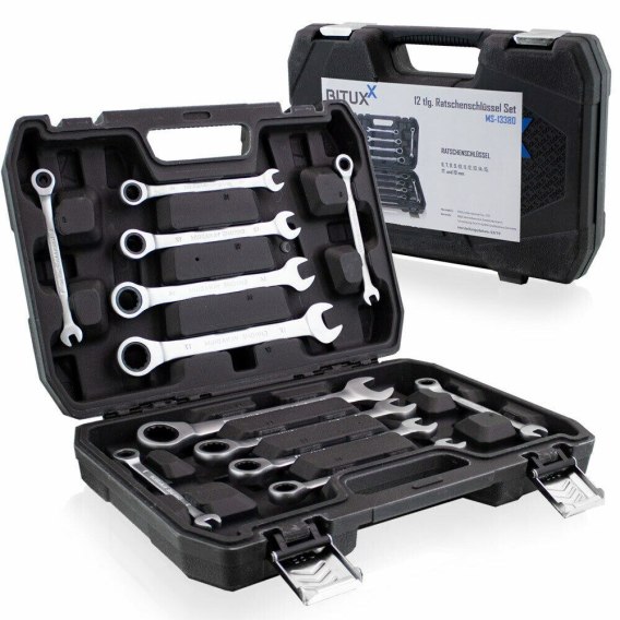 Zestaw składa się z 12 kluczy zapadkowych wykonanych z trwałej i odpornej stali chromowo - wanadowej i dostarczany jest w solidnej obudowie z tworzywa sztucznego.