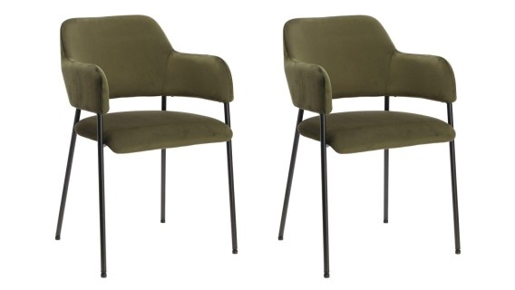 Zestaw 2 krzeseł Lima w tkaninie velvet zielonej. Krzesło z podłokietnikami Lima to elegancki model, dzięki któremu twoja jadalnia nabierze niepowtarzalnego charakteru. Na podstawie wykonanej z malowanego proszkowo metalu spoczywa siedzisko z elastycznej pianki poliuretanowej tapicerowane tkaniną Dublin fabric olive green 52. Nóżki krzesła są od spodu zabezpieczone nakładkami. Mebel posiada podłokietniki wyprofilowane wraz z oparciem z jednego elementu. Wymiary: 54x55x82cm Waga: 7,1kg