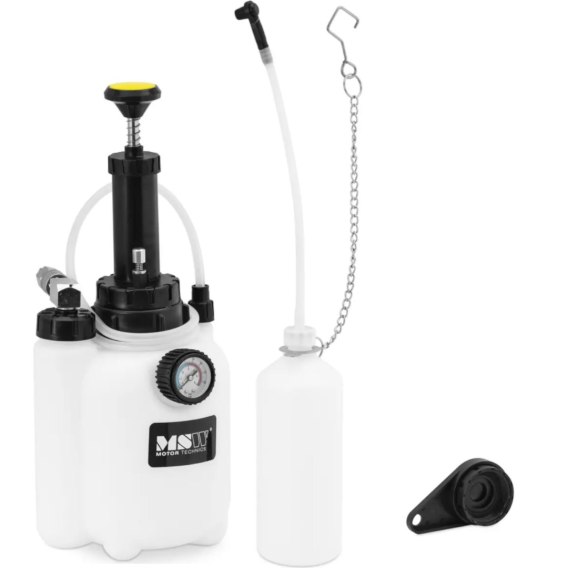 Odpowietrznik hamulców marki MSW to wszechstronna ręczna pompa próżniowa. Dzięki bogatej gamie akcesoriów, oprócz odpowietrzania i wymiany płynu hamulcowego, można sprawdzić ustawienia i funkcje układów pneumatycznych czy hydraulicznych. Dzięki gwintowi 45 mm narzędzie motoryzacyjne nadaje się do prawie wszystkich europejskich typów pojazdów i nie powinno go zabraknąć w żadnym warsztacie samochodowym lub samochodowym. Urządzenie pozwala szybko i łatwo sprawdzić przewody, a w razie potrzeby bezpośrednio uzupełnić lub wymienić płyn hamulcowy. Następnie możliwe jest również odpowietrzenie hamulców. Można go użyć także do testowania systemów ciśnieniowych i próżniowych, co ułatwia rozwiązywanie różnorodnych problemów. Oprócz licznych opcji połączeń sprzęt dysponuje dużym i czytelnym manometrem z podwójną skalą. Zapewnia on wszechstronne oraz łatwe użytkowanie. Tester ciśnienia pracuje z dużą dokładnością w zakresie pomiarowym od -2,07 do 2,76 bar. Do odpowietrzania nie potrzeba żadnych narzędzi pomocniczych ani zewnętrznego źródła zasilania: po prostu należy napełnić i pompować. Zestaw został zaprojektowany tak, aby jedna osoba mogła sprawdzić i odpowietrzyć hamulce. Odpowietrznik jest wykonany z wyjątkowo stabilnego i odpornego na korozję tworzywa sztucznego. Dzięki wytrzymałemu materiałowi urządzenie do odpowietrzania jest bardzo trwałe oraz łatwe w czyszczeniu.