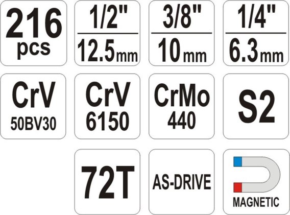 | Zawartość zestawu | grzechotki: 1/2"(12.7 mm): 255 mm;72T, 3/8"(9.5 mm): 200 mm;72T, 1/4"(6.3 mm): 155 mm;72T, pokrętło do nasadek 1/4"(6.3 mm): 150 mm, pokrętło do nasadek z adapterem do bitów 1/4"(6.3 mm): 200 mm |