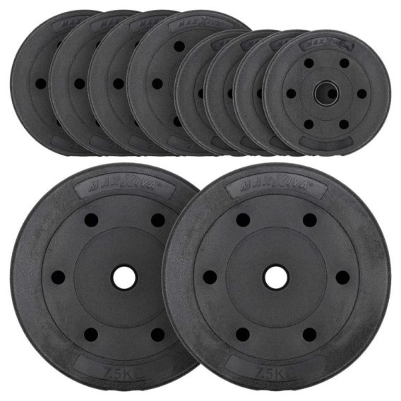 - waga: 30 kg (2x 7,5 kg, 4x 2,5 kg, 4x 1,25 kg)