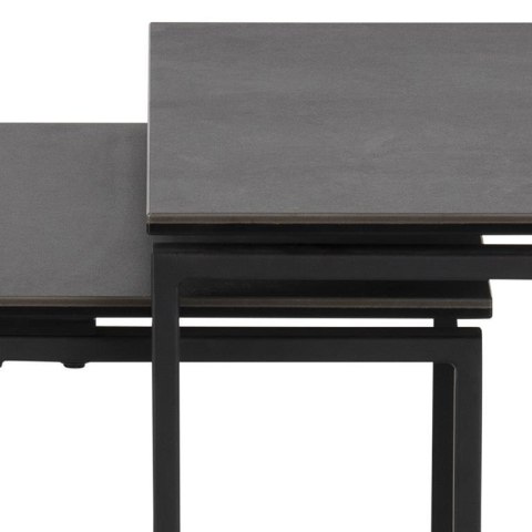 Nowoczesny zestaw stolików Katrine to trzy stoliki o różnych wielkościach. Ponadczasowe połączenie metalu z ceramiką tworzy ciekawą kompozycję. Ceramiczne kwadratowe blaty stolików mają grubość aż 8 mm. Metalowa podstawa stolików natomiast została pomalowana proszkowo na czarno. Wymiary stolików (cm): 50x50x55; 43x43x50; 36x36x45