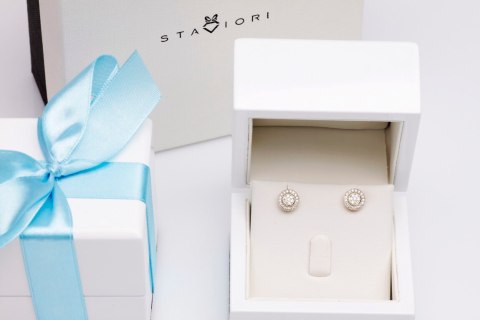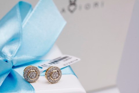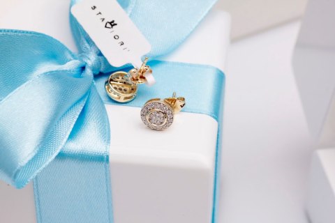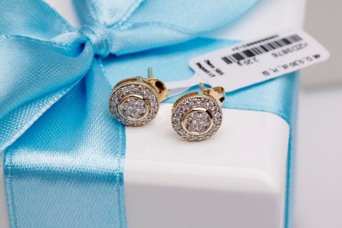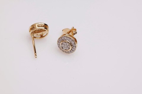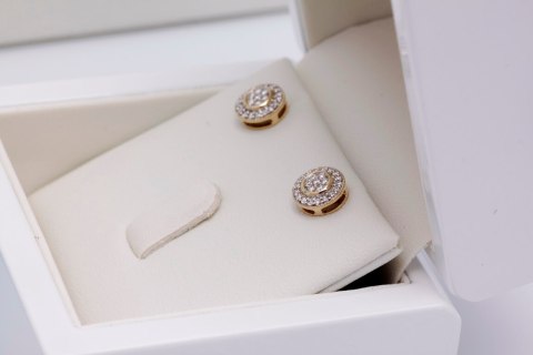 Staviori Kolczyki. 48 Diamentów, szlif brylantowy, masa 0,30 ct., barwa H, czystość SI2. Żółte Złoto 0,585. Średnica około 10 mm.