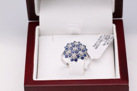Staviori Pierścionek. 7 Diamentów, szlif brylantowy, masa 0,04 ct., barwa G-H, czystość SI1. 24 Szafiry, masa 0,80 ct.. Białe Złoto 0,585. Średnica korony ok. 15 mm. Wysokość 6 mm. Szerokość obrączki ok. 2 mm.
